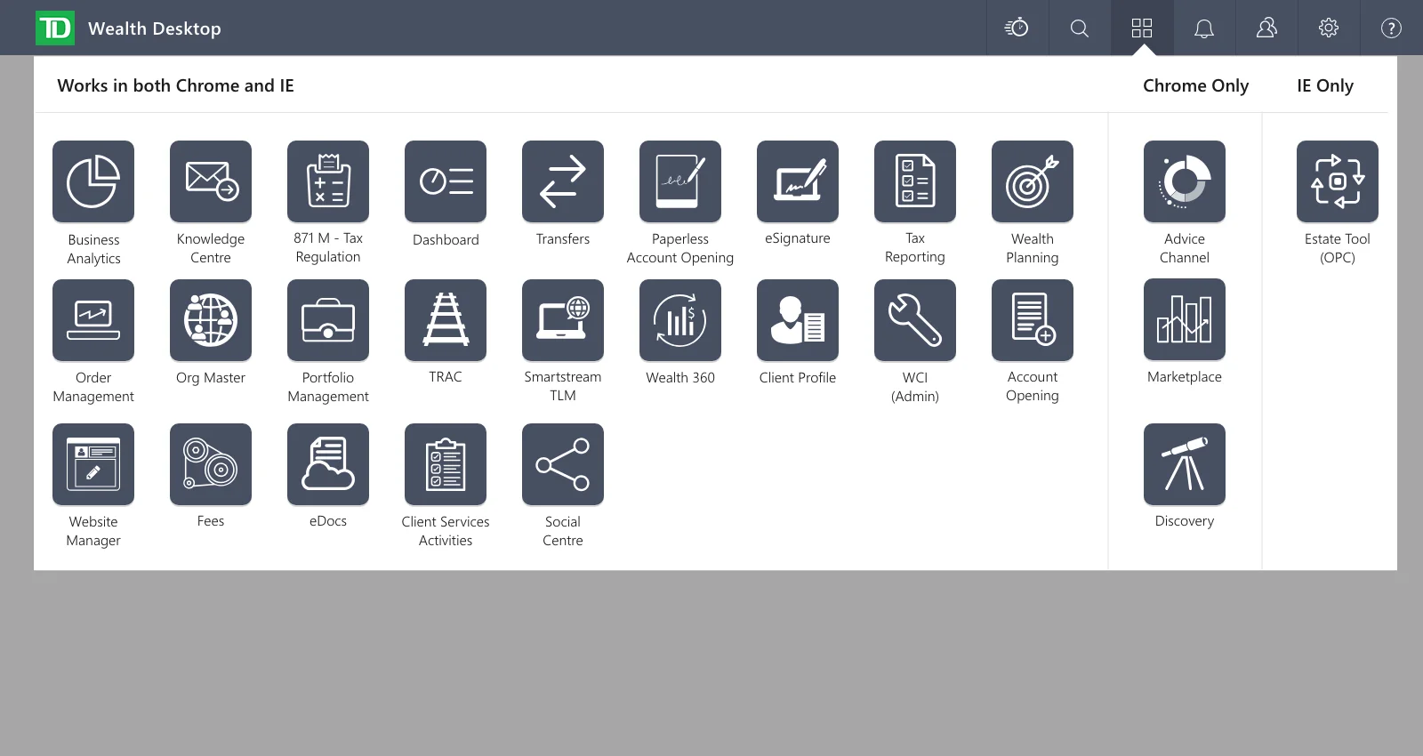 When the Wealth Team contracted me directly, I began designing a new platform integrating multiple (26) legacy applications into one central advisor tool. My role included liaison between all affected teams that funneled into this platform while defining Visual Design Standards for all and User Experience direction by supplying teams with wireframes / visual mock-ups / interactive prototypes detailing how to integrate their applications with this platform that I built.